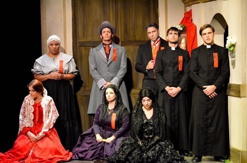 La obra cuenta con un importante despliegue escénico dónde todos los detalles fueron cuidados. La escenografía giratoria que representa tanto el interior de la casa de la protagonista como la parroquia, dan un marco interesante para el pasaje entre escenas. También es de destacar el lindo diseño de vestuario de época a cargo del modisto Pablo Battaglia.